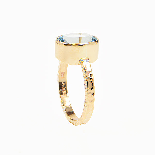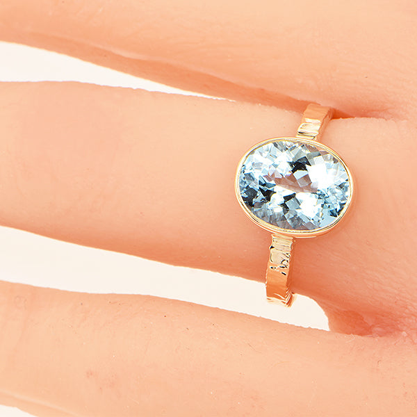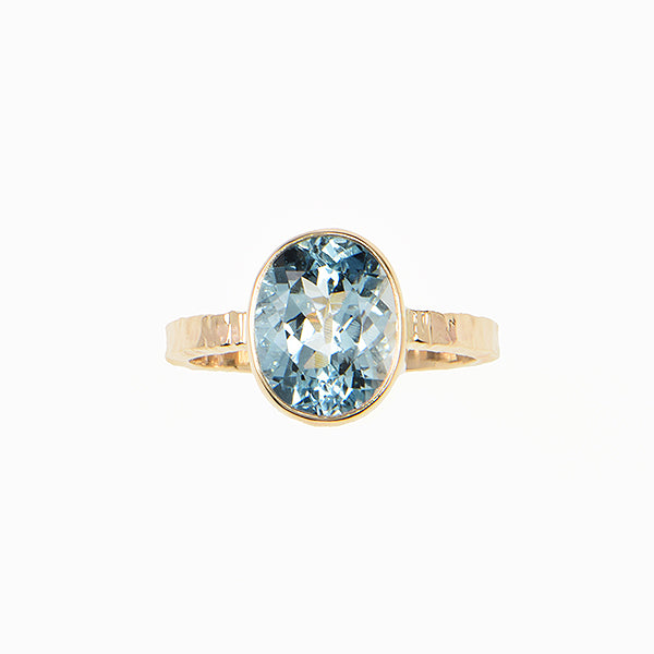 Beautiful flower-cut Aquamarine in a true ocean color. Bezel setting and forged band, hammered texture on three sides.