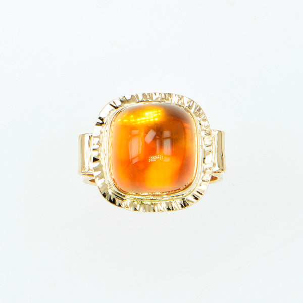 Honey Citrine glows as if lit from within because of it's high dome shape. Bezel setting with hammered texture frame. Forged band with hammered texture on three sides.
