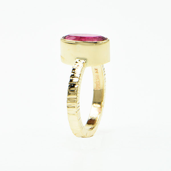 When pink Tourmaline has the intensity of Ruby it is called Rubellite. Beautiful color and flower-cut. Bezel setting. Forged band, hammered texture on three sides.